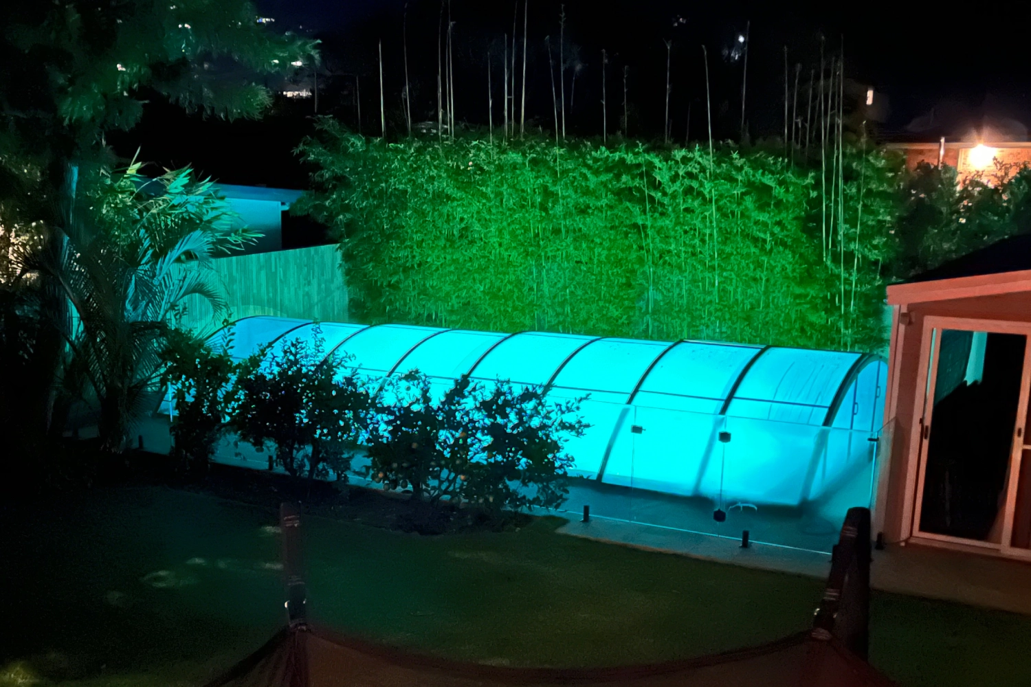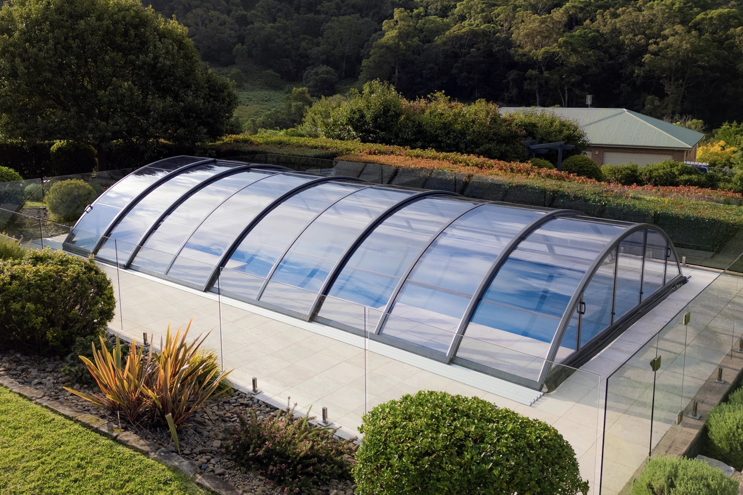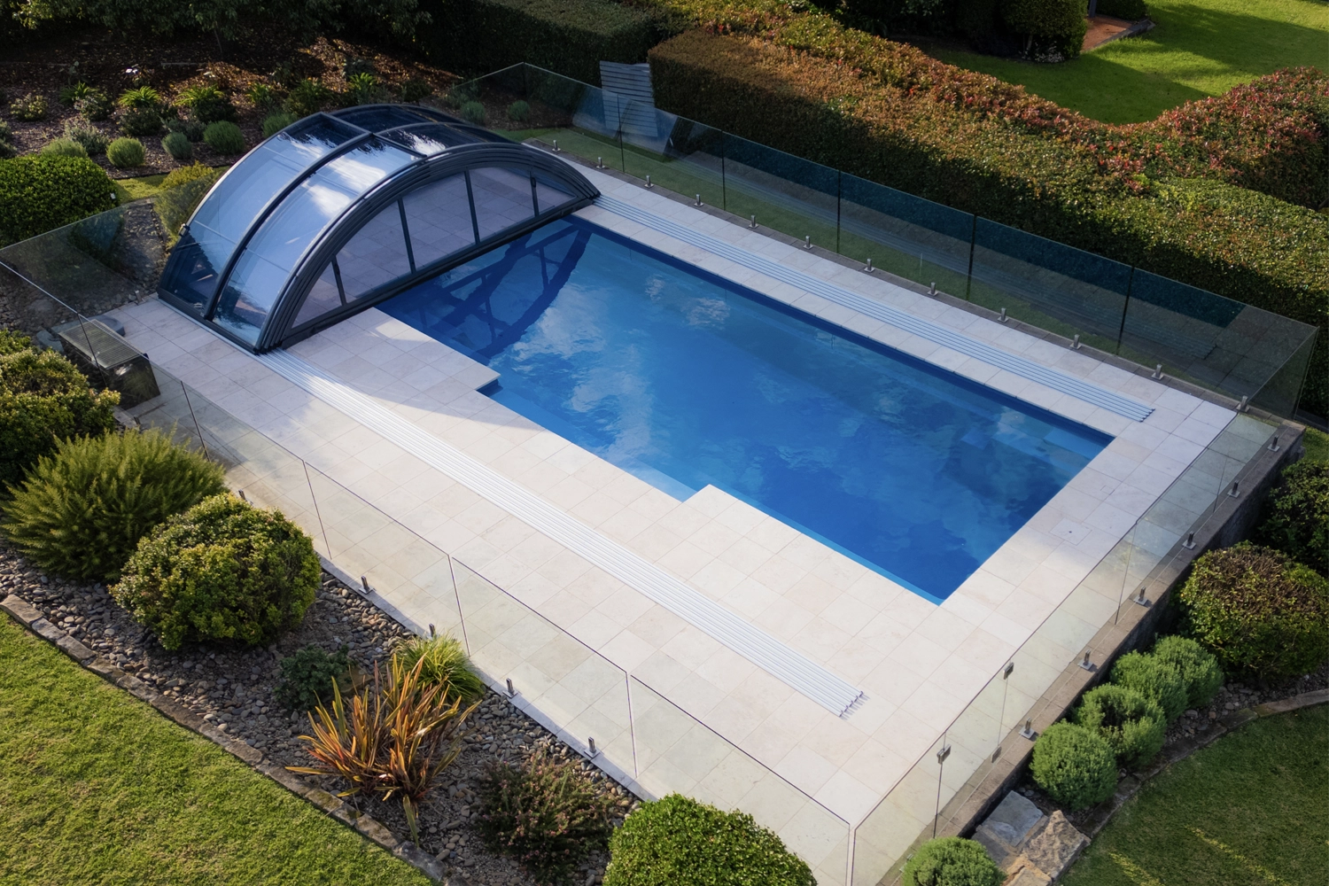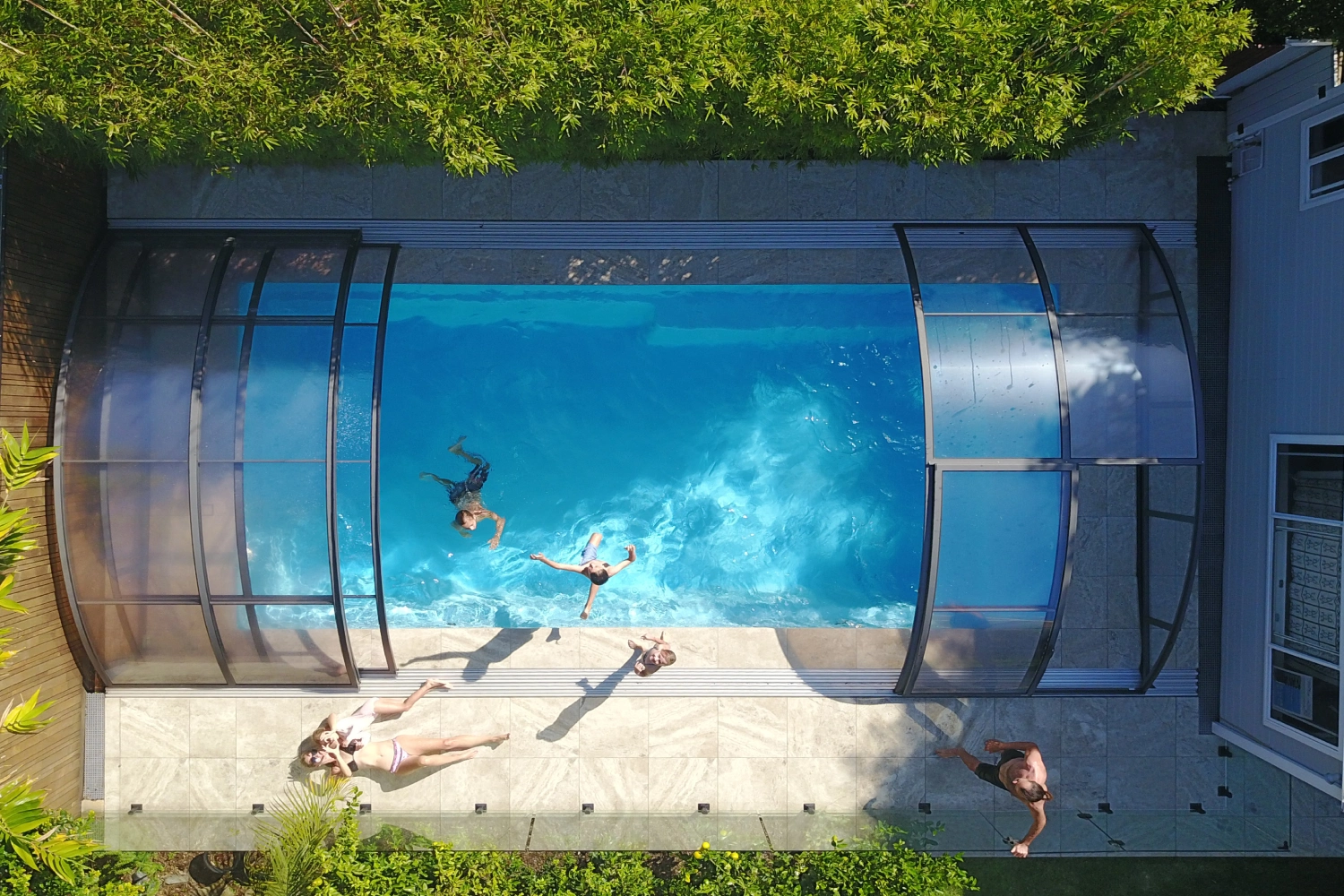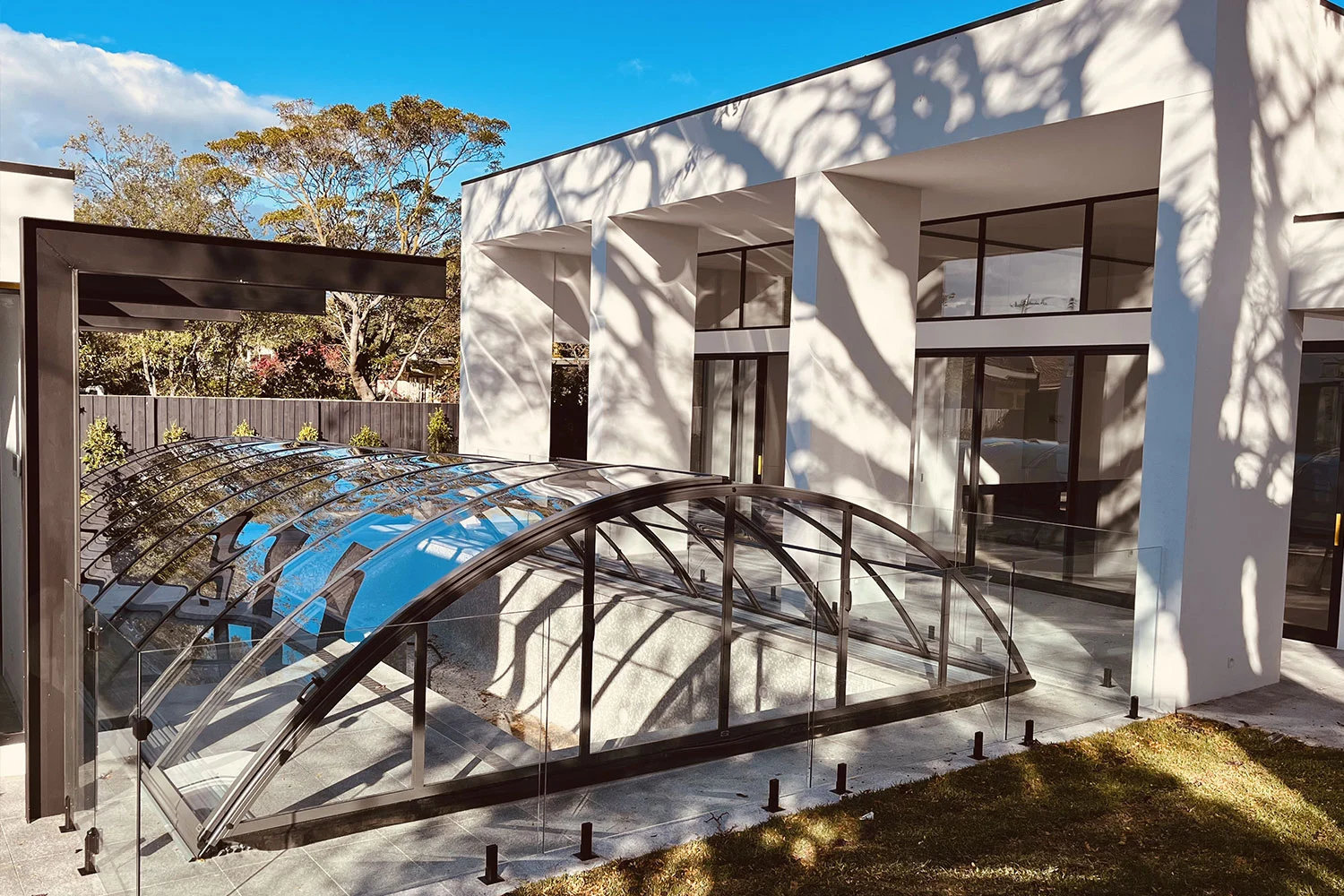 Our telescopic/retractable swimming pool enclosures are made with premium European polycarbonate, designed for lasting durability and UV protection to withstand the Australian climate. This UV protection also safeguards the skin of people using the pool. The default 4 mm clear compact polycarbonate provides an elegant look and exceptional transparency. For those seeking a more economical choice, we also offer 8 mm twin wall polycarbonate. Both materials boast superior resistance, insulation, and UV protection. Tinted polycarbonate versions are also available in custom-made production.