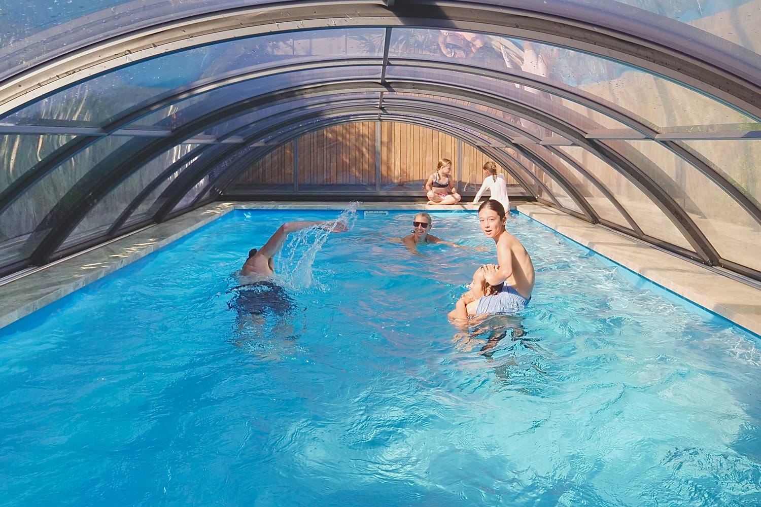 Our telescopic swimming pool enclosures are built with top European quality aluminium, ensuring both lightness and extreme resistance. Ideal for every structure type—whether curved, angular, with straight or cut sections. This strength allows us to create relatively thin structures that blend beautifully with outdoor environments.