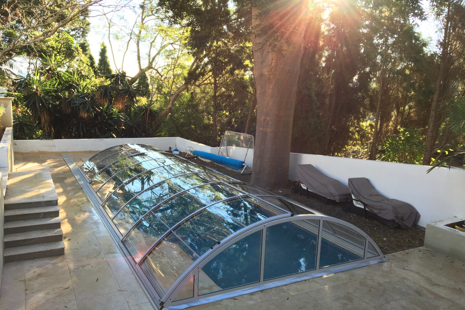 For custom-made enclosures, we offer an optional swing-up feature for the bottom segment of the panels. This innovation allows for smooth repositioning of the structure over typical poolside barriers like steps, handrails, water feature walls, or diving platforms. It also facilitates the use of the entire length of the pool for swimming, even when the enclosure is retracted and there’s limited space behind the pool.
